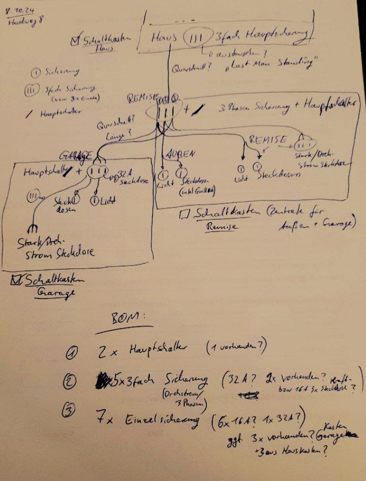 Aktuell ist die Idee bei den drei Abnahmestellen des Starkstromkabels (Remise, Zwischengang, Garage) jeweils eine Phase von dem Starkstromkabel zu verwenden und dann jeweils in einen Sicherungskasten in Licht und Steckdosen aufzuteilen. Wir könnten aber auch eine Phase der Starkstromleitung für Licht bestimmen und eine für Steckdosen, egal welche Abnahmestelle. Was sagst du @timm ?